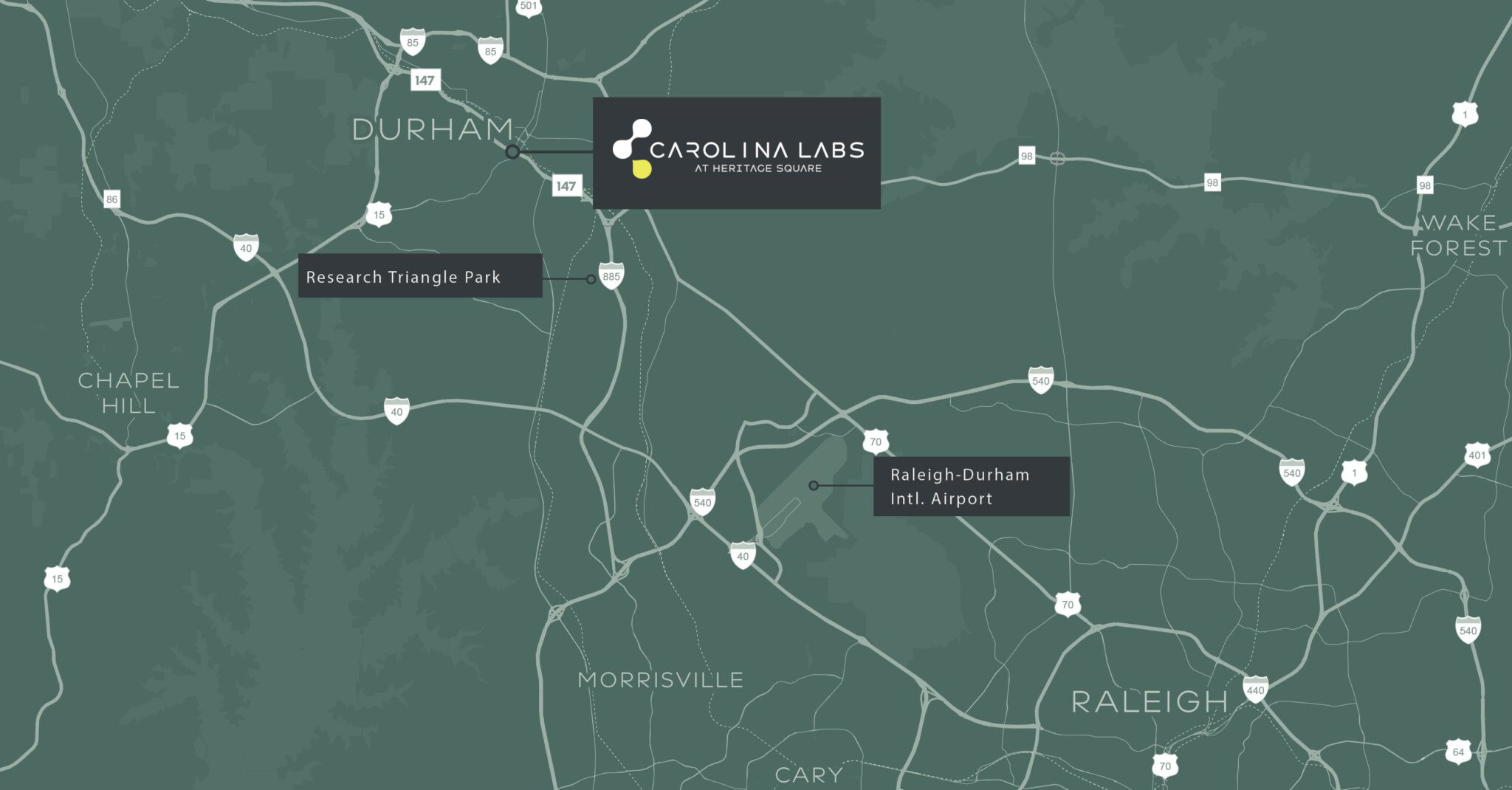 Carolina Labs at Heritage Square promises to ignite discovery in the urban core of Durham. The campus is located along Highway 147, the central highway that runs through Durham and connects the site directly to I-40 and I-95. RDU International Airport, Research Triangle Park, and Downtown Raleigh are only 15-20 minutes away.